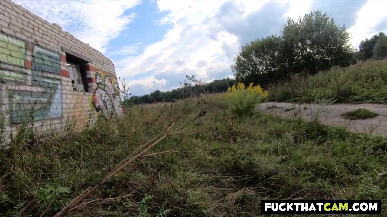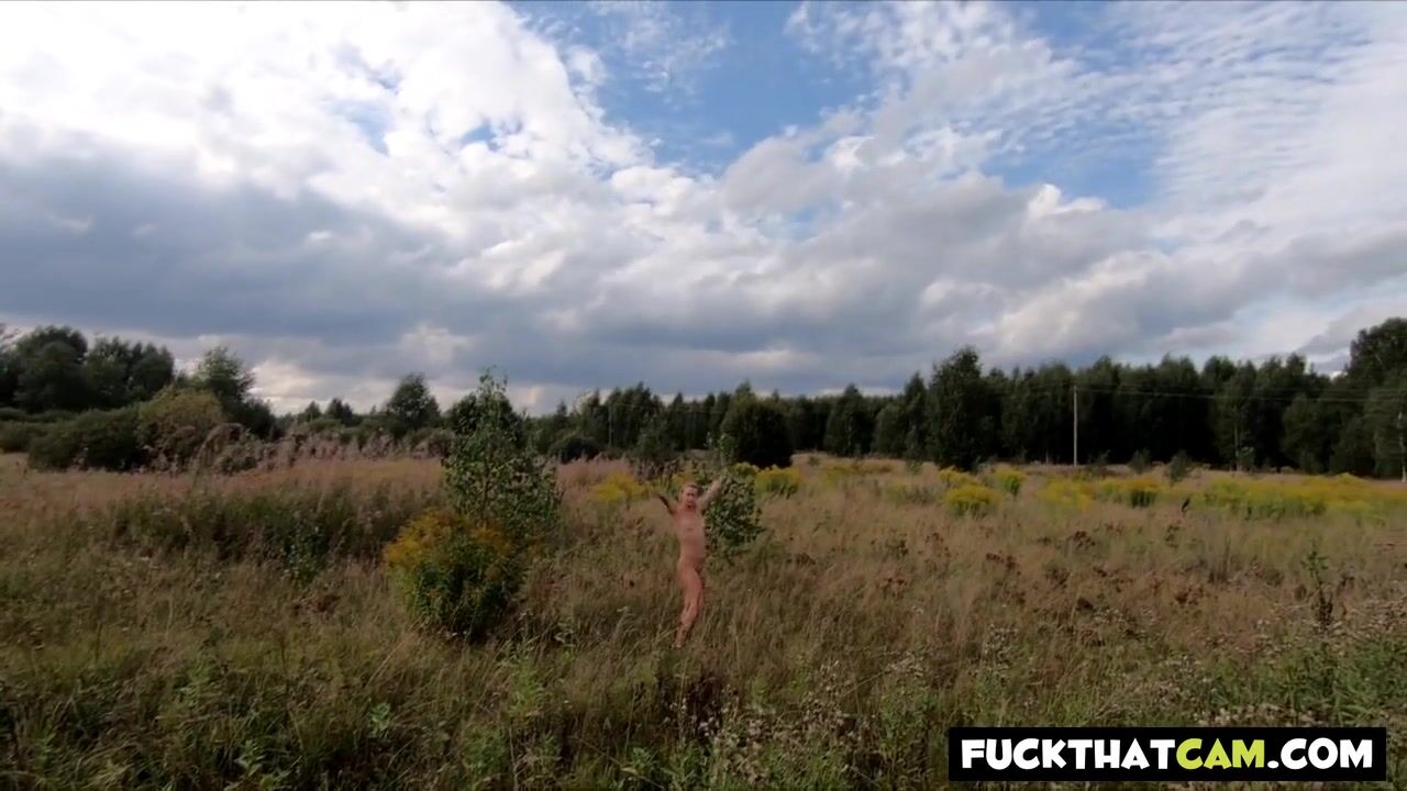 Blonde exhibitionist with a big ass loves to show off her body in public, walking naked through ruins and risking it all for a thrilling outdoor webcam show, ending with a footjob.